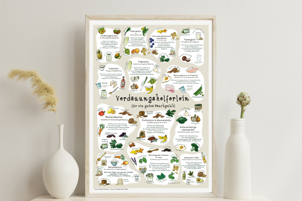 Ein illustriertes DIN A2 Poster für die Küche, mit vielen Nahrungsmitteln und Infos für die Verdauung
